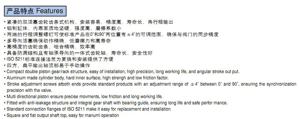 • 緊湊的雙活塞齒輪齒條式機構,安裝容易,精度高,壽命長,角行程輸出