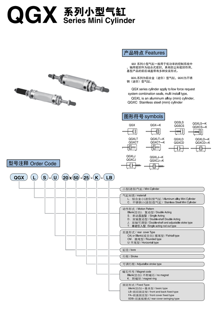 QGXL系列小型氣缸,采用鋁材質(zhì)缸體,輕便靈活,動(dòng)作可靠。 工作壓力:1-9.0MPa,保證耐壓力:13.5,緩沖形式:緩沖墊片,環(huán)境溫度:0-70℃,活塞運(yùn)動(dòng)速度:50-800mm/s,工作介質(zhì):干燥潔凈含油霧的壓縮空氣缸