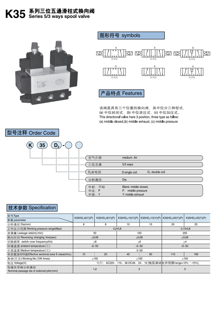 電控/氣控換向閥 K35D系列 三位五通,可提供定制